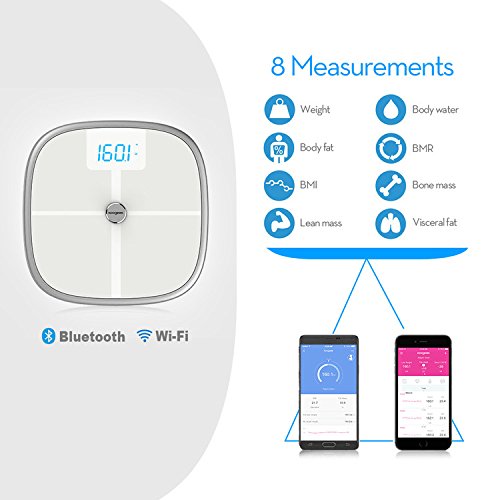 -. Feature : 8 Precision Body Measurements - Weight, BMI (Body Mass Index), Body Fat Mass, Lean Mass, Bone Mass, Total Body Water, BMR (Basal Metabolic Rate) and Visceral Fat / Bluetooth & Wi-Fi Connectivity - Automatically upload your measurements via Bluetooth 4.0 or Wi-Fi, whether you are at home, or while on the road. Note: only be used on 2.4G network / Free Fitness APP - Lets you set achievable goals and monitor your health trends in charts and graphs whenever and wherever. (Available on iOS and Android). Use BIA method and "Step-On" technology / 16 Users Tracking Management - Through a simple set-up process, the scale can be programmed to automatically recognize up to 16 users / Weigh your Baby - Weigh yourself first, then step on the Scale holding your baby. Your baby's weight will be calculated and synced to the app automatically. Launch the Koogeek app to check your child's weight trend