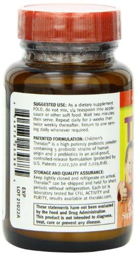 Children's Theralac® is Theralac in granular, powdered form. It uses the same patented alginate-delivery technology that has made Theralac famous, allowing probiotic strains to make it through stomach acid ALIVE! Instead of having to open capsules like when Theralac is used for children, Children's Theralac is ready to use! Children's Theralac provides 25 billion CFU per serving, guaranteed through expiration if kept refrigerated. Short periods at higher temperatures are okay, such as during shipping or when travelling. All five probiotic strains in Theralac are of human origin, are rated G.R.A.S. for human consumption by the FDA, and have a proven safety record. The prebiotics in Children's Theralac, LactoStim® and Lactoferrin, benefit the probiotic strains by giving them an advantage over undesirable intestinal bacteria. Lactoferrin is derived from milk so check with your pediatrician before giving Theralac if your child has milk allergies. Children's Theralac is packaged in nitrogen flushed, amber glass bottles containing both oxygen and moisture absorption packets for Totally Inert Packaging (TIP®).Feature