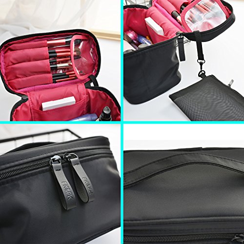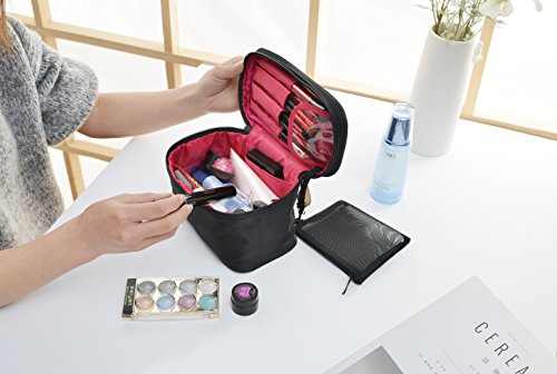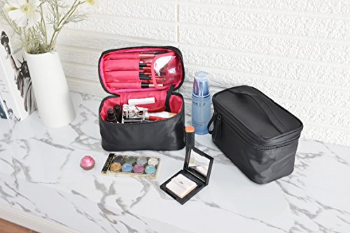 - 【Top-grade Material】Travel Makeup Bag, outside material is good quality black nylon fabric, easy to clean, dark color not easy show the dirty. Inside is red lining with thick sponge, give more protection for your cosmetics.
