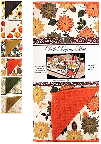 Microfiber Dish Drying Mat, Harvest Designs, 16" x 24" Absorbent Quick Drying, Fine Cushioned Fabric (Bloom ~ Orange)