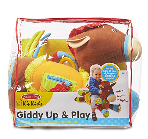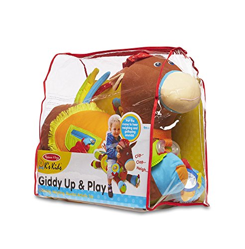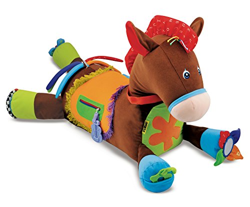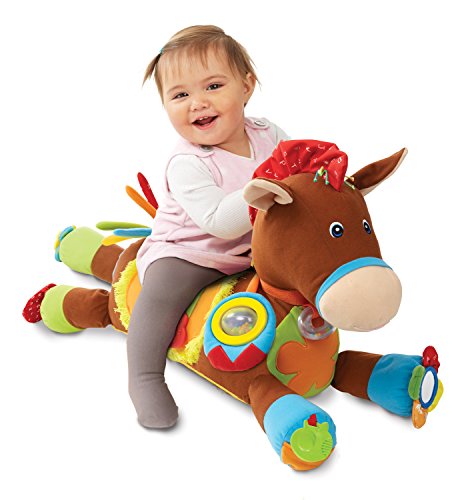 Giddy Up & Play invites babies to pat, pull, and even climb right on! This precious pony has rattles, textured tabs crinkle fabric, and fringe to capture babies’ attention, and plays trotting and neighing sounds when patted or ridden. It’s huggably soft and packed with whimsical novelties to engage the senses and nurture growing skills. A non-slip bottom prevents slipping and sliding.