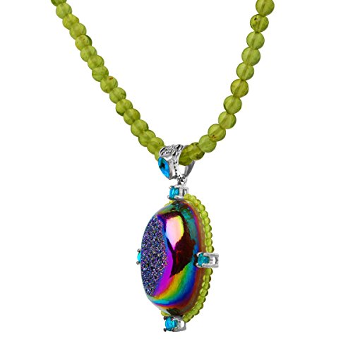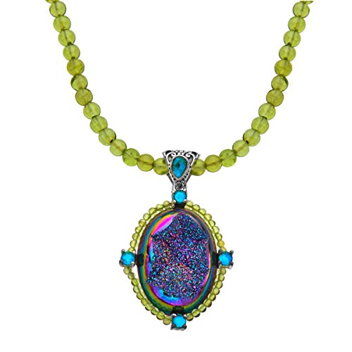 Resplendent rainforest tones dance across the face of this opulent Sajen necklace! A forest druzy with an opalescent purple cast is framed by celestial light green quartz and shimmering peridot suspended in a setting of sterling silver. Necklace is 18 inches in length, pendant measures 1 5/8 by 1 inches.Feature