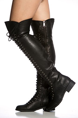 Binding : Apparel Product Description We love taking thigh high to another level. This boot features adjustable laces, inner zipper for closing, soft padding inside, and cushioned insoles. Add some edginess to your collection of thigh highs and style it up with a motorcycle jacket for the complete chic edgy look. 0