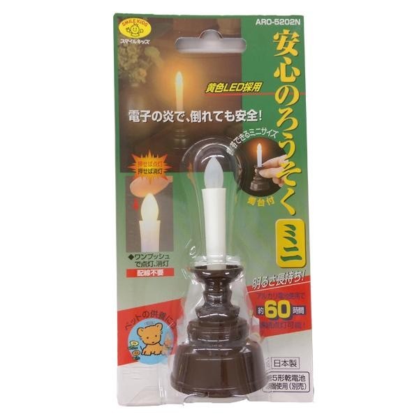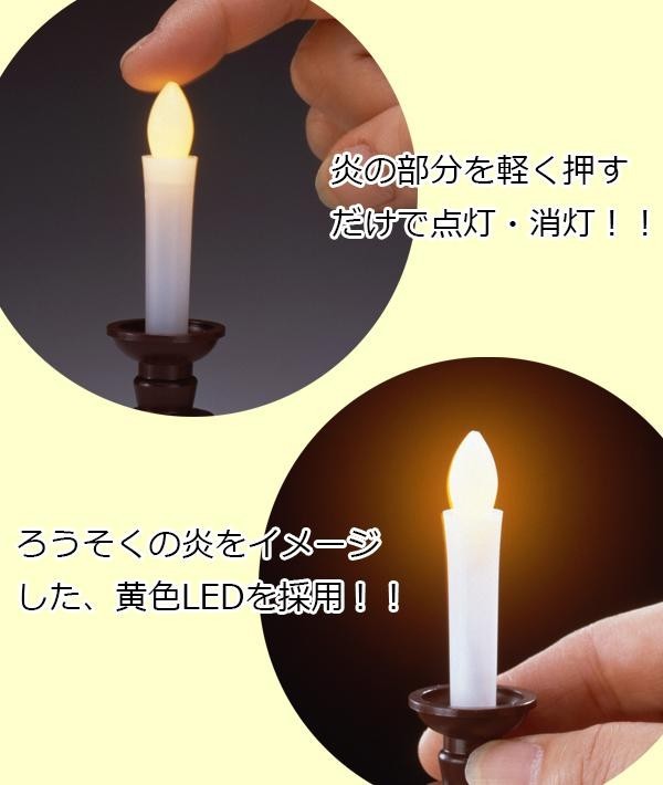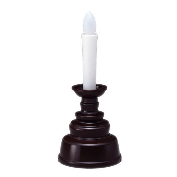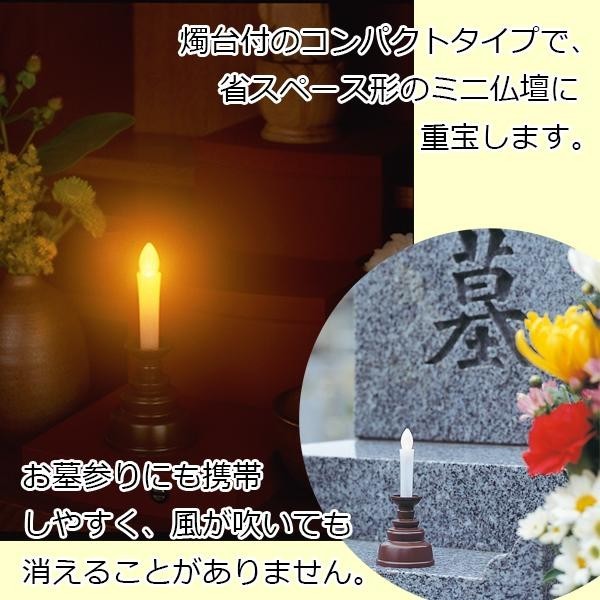 | 電池式なので、マッチ・ライター・配線も不要!スイッチONすればろうそくの先端が黄色く光ります。スイッチは炎の部分を軽く押すだけで点灯・消灯できて簡単。燭台付のコンパクトタイプで、省スペース形のミニ仏壇に重宝します。お墓参りにも携帯しやすく、風が吹いても消えることがありません。1日15分で約7ヶ月使用可能です。 |