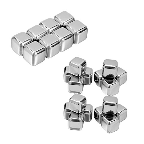 Product Description This is a special gift package edition. Whiskey ice cubes are small stones, which you can keep in your freezer, and put in your whiskey or other drinks instead of using ice cubes. The biggest advantage to use stainless steel chilling reusable ice cubes, is to have your drink not diluted by the traditional ice cubes. Our square stainless steel ice picks is one of the best in the market. It contains a non-toxic gel inside each cube, which will keep the drink extra cold. You usually only need to freeze these cubes for1-2 hours, and then you can toss them into your beer, red wine, beverage or whiskey, enjoy the non-diluted cooling. These stones are very durable, reusable and easy to wash and clean. How to use: 1. Please wash the stainless steel ice cubes before use.(Rinse with warm water) 2. Place the stainless steel cubes into your freezer for at least 1 or 2 hours to chill 3. Gently place the square reusable Whiskey stones in your glass 4. Add a serving of your favorite liquor or other beverage. 5. Allow the Whiskey stones to cool the liquor or beverage in your glass 6. Several minutes later, you will enjoy your favorite beverage. Notes: Do not swallow and eat them. Keep it away from your kids! Not for lager glasses or tall drinks. They will not get your drink as cold as ice, but sure do not dilute your drink. Includes: Package: 24pcs stainless steel chilling reusable ice cubes, set of 4pcs, total 6 sets packed in the paper box.