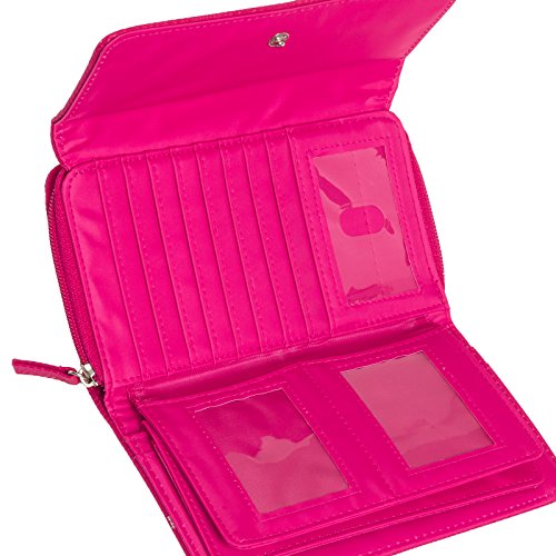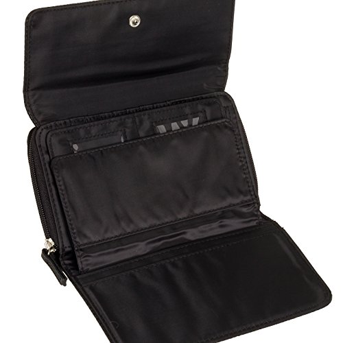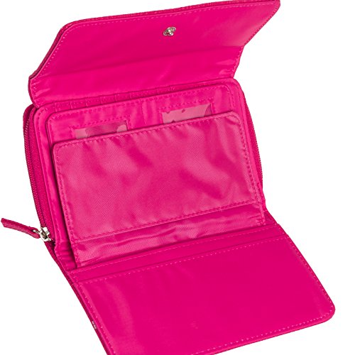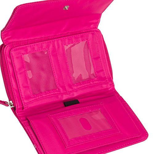 -. Feature : Built-in RFID blocking protection that will shield your credit card, passport, and driver's license information from being pulled or even deleted by electronic thieves / Interior features 8 credit card slots, 5 ID/ photo windows, 2 checkbook sized slip pockets, and a pen loop / Exterior slip pocket and zip pocket allows for additional, easily accessed storage / Snap closure keeps all the important things safe and sound / Measures 7.5" x 4.75" x 1.75"