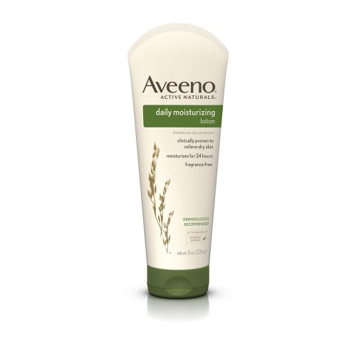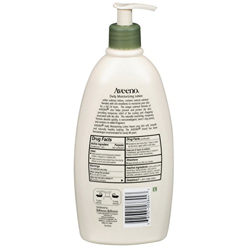 Aveeno daily moisturizing lotion unlike ordinary lotions, contains natural oatmeal blended with rich emollients to moisturize your skin for a full 24 hours. The unique oatmeal formula of Aveeno also helps prevent and protect dry skin, providing temporary relief of the scaling and chapping associated with dry skin. This naturally nourishing, nongreasy formula absorbs quickly, is noncomedogenic (won't clog pores), and contains no added fragrance. Aveeno daily moisturizing lotion leaves your skin soft, smooth and naturally healthy looking.Feature