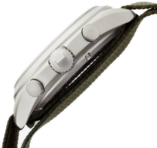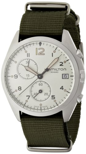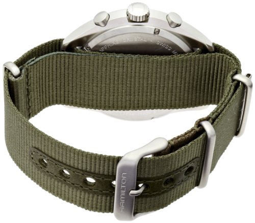 ReleaseDate : 2014-09-30 Studio : Hamilton Publisher : Hamilton Binding : Watch Product Description Stainless steel case with a khaki canvas strap . Fixed stainless steel bezel. Silver dial with luminous hands and Arabic numeral hour markers. Minute markers around the outer rim. Dial Type: Analog. Luminescent hands and markers. Date display at the 3 o'clock position. Chronograph - two sub-dials displaying: 60 second and 30 minute. Quartz movement. Scratch resistant sapphire crystal. Solid case back. Case diameter: 41 mm. Case thickness: 13 mm. Round case shape. Band width: 22 mm. Tang clasp. Water resistant at 100 meters / 330 feet. Functions: chronograph, date, hour, minute, second. Casual watch style. Hamilton Pilot Pioneer Chronograph Mens Watch H76552955. 0