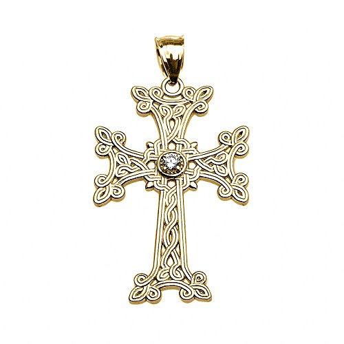 -. Title : 14k Yellow Gold Armenian Cross Solitaire Diamond Pendant