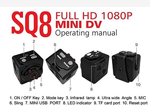 Features: ● SQ8 mini 1080P full HD car DVR camera recorder ● High definition full HD1080P ● Compact design, portable handheld ● Video format: 1920 x 1080P, 1280 x 720P ● Support TV out, TV monitor video connection ● Image resolution: 12MP (4032 x 3024) ● Support 32GB TF card max. (not included) ● Image proportion: 4 : 3 ● Support system: Windows ME / 2000 / XP / 2003 / Vista, Mac OS, Linux ● Battery capacity: 200mAh ● Working time: About 100 minutes at 1080P 30fps ● Charging time: About 2 - 3 hours ● Charging voltage: DC 5V ● Interface type: Mini 8 pin USB ● Cable length: 80cm ● Built-in lithium battery sustainable camera up to 100 minutes ● Chipset: Otus Model: SQ8 Type: Full HD Dashcam Chipset Name: Otus System requirements: Mac OS x 10.3.6 above,Win 7,Windows 2000 / XP / Vista Max External Card Supported: TF 32G (not included) Class Rating Requirements: Class 10 or Above Battery Type: Built-in Charge way: USB charge by PC Working Time: About 100 minutes at 1080P 30fps Camera Pixel : 12MP Decode Format: MJPG Video format: AVI Video Resolution: 1080P (1920 x 1080),720P (1280 x 720) Video Frame Rate : 30fps Image Format : JPG Image resolution: 12M (4032 x 3024) Audio System : Built-in microphone/speacker (AAC) Motion Detection: Yes USB Function: USB-Disk Interface Type: Mini USB Package Contents: 1 x Mini Car DVR Camera, 1 x USB / TV Out 2-in-1 Cable, 1 x Bracket, 1 x Clip, 1 x Bilingual User Manual in Chinese and English