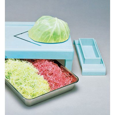 ● Part number, width × depth × height (mm), mass (kg) ● CALV 01, 380 × 280 × 172, 1.3 ● Effective slice size: up to 175 mm Manual slicing Manually any sliced cabbage slices V shape