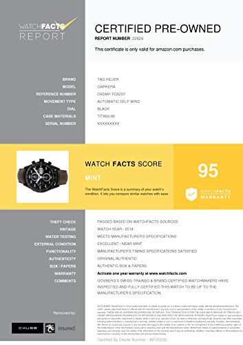-. Binding : Watch -. Brand : TAG Heuer -. Department : mens -. Feature : Tag Heuer Carrera CV2A81.FC6237 with titanium bezel and black dial / Authenticated by WatchFacts. Grade Rating: 95 / Condition: Mint / Comes with original box and manufacturer's papers offered with this watch / Automatic-self-wind movement / Watch year: 2014 -. Label : Tag Heuer -. Manufacturer : Tag Heuer -. MPN : A2HN-WWP072CARRERA-ZJ-CPO -. NumberOfItems : 1 -. PackageQuantity : 1 -. PartNumber : A2HN-WWP072CARRERA-ZJ-CPO -. ProductGroup : Watch -. ProductTypeName : WATCH -. Publisher : Tag Heuer -. Studio : Tag Heuer -. Title : Tag Heuer Carrera automatic-self-wind mens Watch CV2A81.FC6237 (Certified Pre-owned)