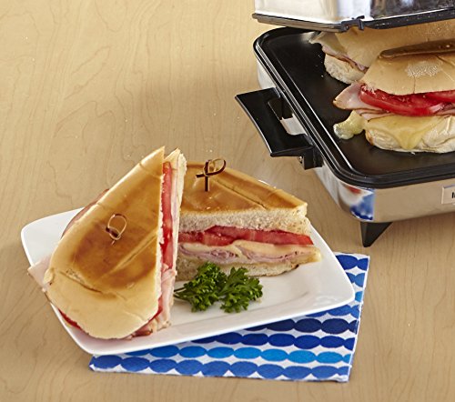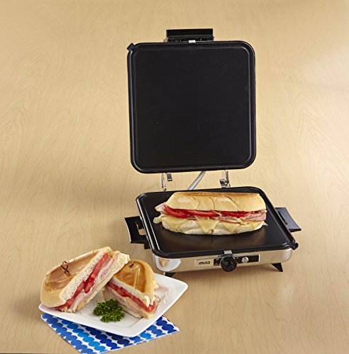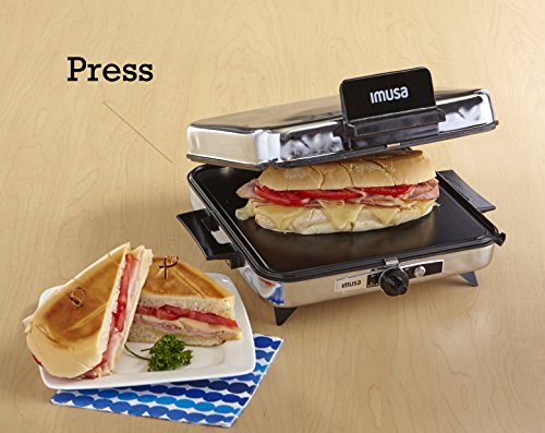The IMUSA Cuban Sandwich Maker allows you to make restaurant-quality Cuban sandwiches- as well as other grilled sandwiches, veggies, pork chops, meats, & more! An adjustable temperature control dial ensures every sandwich you grill will be toasted golden brown to perfection! The reversible plates allow for grill marks or a flat surface.Feature
