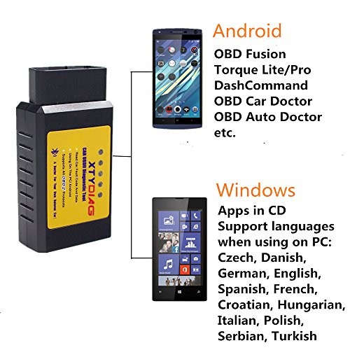 -. Feature : WORK WITH WIDE RANGE OF CARS: XTYDIAG Bluetooth V1.5 OBD2 Code Reader work with all vehicles located in the USA that are model year 1996 or newer that are OBD2 compliant! / Support all protocols including J1850 protocol, this XTYDIAG diagnosis scan tool connect your Android/windows devices via Bluetooth. / MULTI-FUNCTIONS: Read and clear diagnostic trouble codes, check engine to turn off the Check Engine light, display realtime data, tell you the problem of your car. / SUPER EASY TO USE: Install the APP on your device, plug this OBDII scan tool in OBD2 port, connect the obd2 with device via Bluetooth, run the download App with simple settings, and then you can use it. / SUPPORT APP: Torque Pro, Torque Lite (free), OBD Car Doctor (free), etc. A very useful code reader to diagnostic your car, solve some simply problem by yourself, save time and money.