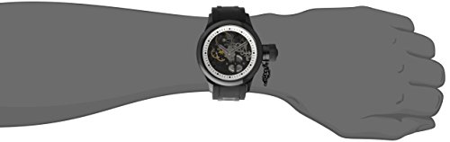 Function meets fashion in this Invicta Russian Diver's watch, which features sophisticated design details such as a black polyurethane strap with stainless steel barrel accents, a large screw-down cap, and a fascinating skeleton window.