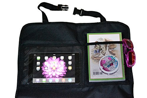 AWESOME BACK SEAT ORGANIZER WITH CLEAR POCKET TO HOLD YOUR CHILD’S iPad OR TABLET. This will entertain your child and allow for a more peaceful car ride and is a great backseat organizer.