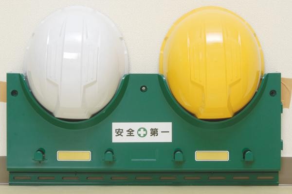 ヘルメット整理用の2ヶ掛けヘルメットラックです。安全をイメージした緑色を基調にしたお手頃のヘルメットラックです。