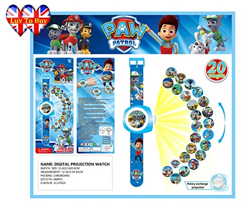 -. Binding : Toy -. Brand : Watch -. Department : kids -. EAN : 9031587452396 -. Feature : Same or next day dispatch for all orders! Sadly we cannot change the Amazon delivery setting however ALL ORDERS ARE DELIVERED WITHIN 4-8 DAYS. This Paw Patrol children's watch is a colourful and ideal for young children who are a fan of the show. It displays the date and time and also has a projection/light switch that will show Paw Patrol on any surface it is shined on. / Normal shows the time in hours and minutes format. To see the month and date press B1 once. / To see the month press B1 and then press B2 immediately and continue until the required date setting is reached. To see the date press B1 and then press B2 immediately and continue until the required date setting is reached. / To see the hour press B1 and then immediately press B2 and continue until the required hour setting is reached. This will display the hour and "A" for AM or "P" for PM. To see the minute press B1 and then immediately press B2 and continue until the required minute setting is reached. To resume normal time display press B2. / While the watch displays the normal time press down on B2 once and it will show the date and month. To resume normal time sisplay,press B2 again.while display the normal time ,press B2 once,it will show the month and date. Press B2 once more immediately ,it will show second. Press B2 again it will resume normal time display. -. IsAdultProduct : 0 -. Label : Paw Patrol -. Manufacturer : Paw Patrol -. MPN : 15480 -. PackageQuantity : 1 -. PartNumber : 15480 -. ProductGroup : Toy -. ProductTypeName : TOYS_AND_GAMES -. Publisher : Paw Patrol -. Studio : Paw Patrol -. Title : Paw Patrol Watch ,Digital Projection Watch For Children,kids