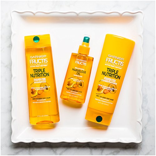 Hair is almost entirely made up of protein, which gives hair its strength. Paraben-free Fructis formulas with Active Fruit Protein, an exclusive combination of citrus protein, Vitamins B3 & B6, fruit & plant-derived extracts and strengthening conditioners, are designed for healthier, stronger hair. Fructis Triple Nutrition's triple restoring action formula, infused with 3 oils: Avocado, Olive, Almond, intensely transforms dry to very dry hair with 3X nourishing moisture* for stronger, smoother, shinier hair. No weigh down. No greasy feel. • Get 3X the moisture with Triple Nutrition system of shampoo, conditioner and leave-in treatment • System intensely transforms dry to very dry hair with 3X nourishing moisture • Stronger, smoother, shinier hair • Triple restoring action conditioner, infused with 3 oils - Avocado, Olive, and Almond *With shampoo, conditioner & leave-in treatment. It’s more than Avocado, Olive & Almond Oils… it’s a fortifying nourisher for very dry hair. Paraben-free Triple Nutrition shampoo, conditioner and leave-in treatment transform dry hair with 3x nourishing moisture.* *With shampoo, conditioner & leave-in treatment. After using Triple Nutrition shampoo, apply conditioner to hair from root to tip. Rinse. Follow with Triple Nutrition leave-in oil.