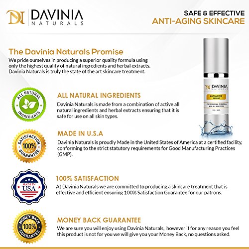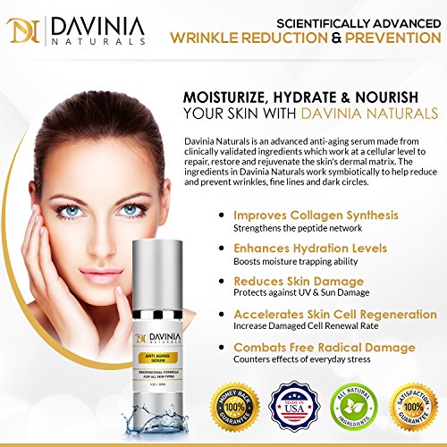Experience younger looking skin like never before with Davinia Naturals. This anti aging serum improves collagen synthesis and will reduce the appearance of wrinkles, fine lines and dark circles.