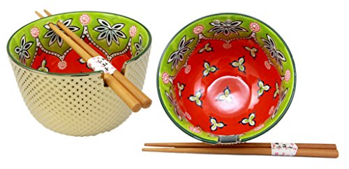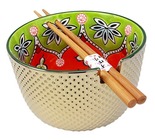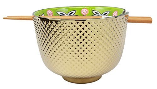These Gold Plated Ramen Bowls are made of ceramic, designed with beautiful floral patterns in deep rich colors. The bowls come equipped with a pair of wooden chopsticks each with built in holes and rest for them (refer to the photos).