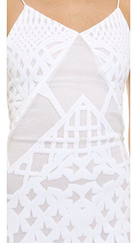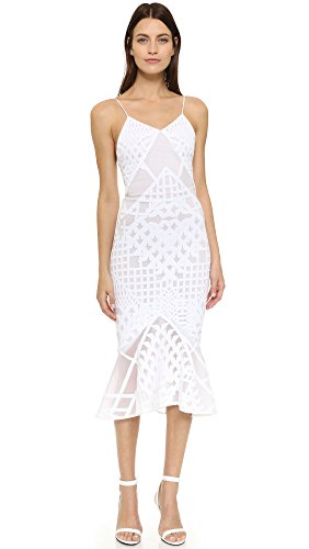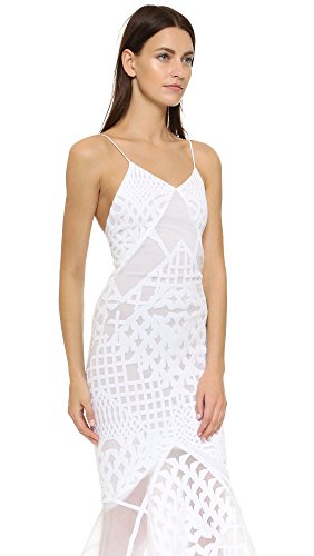 Midi-length mermaid gown with sheer polyester lining and geo-patterned overlays