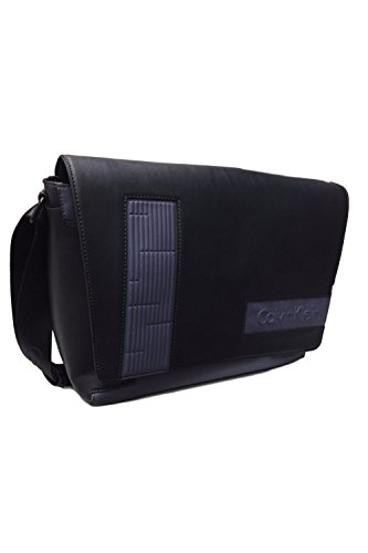 -. Feature : faux leather messenger / magenetic flap closure / textured + raised contrasting accents / raised calvin klein logo / back pocket + interior zip close pocket