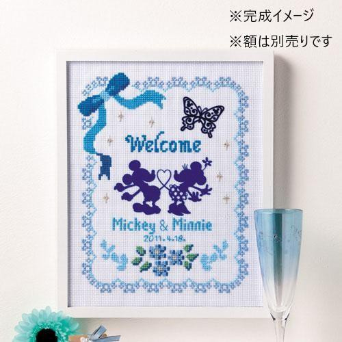 | お花やリボンなどかわいいモチーフが魅力のウェルカムボード。中心のミッキー&ミニーと蝶々はフロッキーワッペンです。技法はクロス・ステッチ。額(W-35)は別売。技術レベルは初級~中級者向。 |