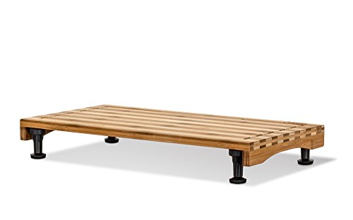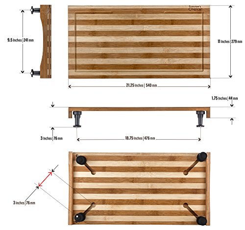 ELEVATED TO SAVE SPACE : A large wooden cutting board with ample room to chop and separate vegetables, meats and spices that fits easily over gas or electric ovens with size adjustable & removable feet that help avoid goopy messes and maximize cooking areas so chefs can use the chopping block on the stove, counter or kitchen table.