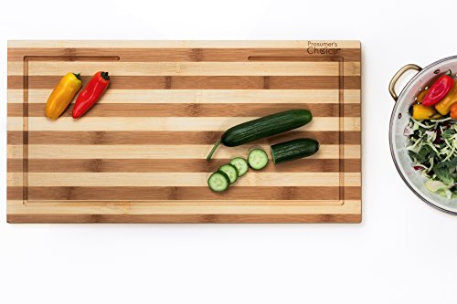 INCLUDES JUICE GROOVES : A sturdy and multi-functional all-natural end-grain bamboo cutting board that is pleasing to the eye but also extremely dense with a wide surface area and juice trap that contains runoff from meats, vegetables and other ingredients and helps prevent cross contamination for a higher level of hygiene and better tasting meals