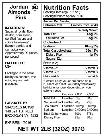 -. Title : Sincerely Nuts Pink Jordan Almonds - Vibrant Pink Sugar Coated - Tasty & Healthy With Protein, Vitamins, Fibers - Sealed for Freshness - 100% Kosher Certified