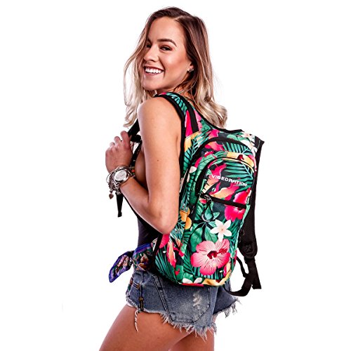 -. Feature : 2.0 Liter BPA Free, Antimicrobial Water Bladder Included. / Bag Dimensions: 17" x 10" x 3.5" Comes with adjustable chest and shoulder straps to fit all sizes and a padded p-board backside for all-day comfort / Tons of storage space! Main Pocket: 15" x 9", Secondary Pocket: 13" x 6", Front Pocket: 8" x 5". / Plenty of room to store spare clothing, wallet, phone, charger, sunscreen, snacks, accessories, and other festival goodies! / Our variety of pack designs will keep you looking stylish and hydrated no matter what the occasion.