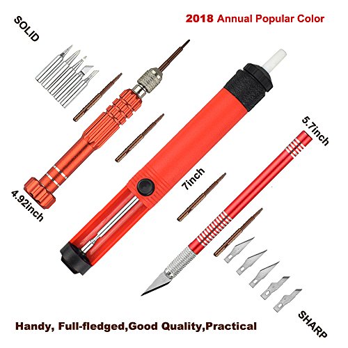 - All-around Soldering Iron Kit : fully equipped with Pliers, 2 pcs Tweezers,6 pcs Engraving Knives(Handle and Blades),Soldering Iron, Suction Tin Pump,5 pcs Soldering Iron Tip(I K B 3C 1.6D), Suction Tin Wire,Screwdriver Set,Stand, Welding Iron Wire,1 pcs Tool Box, very suitable for beginners