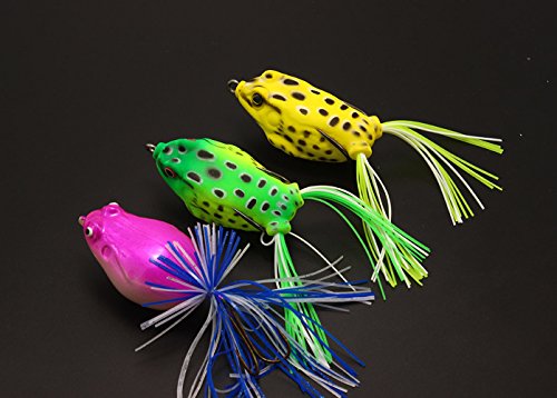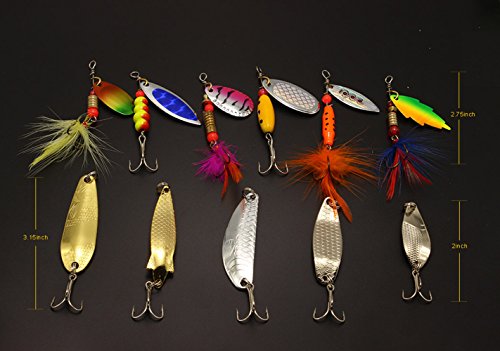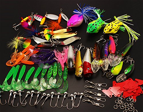 -. Feature : The fishing lure tackle set features various fishing baits, frog lures, soft lures, hard lures, snap swivels, solid rings, lead jig head fishing hooks, plastic slices and a hard plastic tackle box / The fishing lure set contains 10 different baits, 2 poppers, 4 minnows, 2 crankbaits, 1 hard plastic frogs, 2 soft silicone frogs, 5 metal spoons, 2 pencil baits, 6 spinners (4 spinners with rooster tail and 2 inline spinners), 20 single tail grubs and 5 shrimps / Soft silicone artificial baits with life-like bright colors to attract various big fishes, including bass, northern pike, salmon, trout and more; Hard lures with vivid 3D eyes and sharp treble hook helps you to catch fishes more easily / The compact hard tackle box is for easy carrying and storage; size: 1.6 x 9.8 x 7 inches / The fishing tackle includes nearly all the fishing accessories for both freshwater and saltwater fishing, perfect for ocean boat fishing, beach fishing, lake, river, pond and stream; awesome gift for avid angler