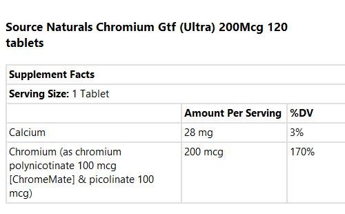 Studio : Source Naturals, Inc. Publisher : Source Naturals, Inc. Binding : Health and Beauty Product Description Dietary supplement. Chromium Picolinate/Chromemate Complex. Ultra Chromium GTF is a 50/50 blend of ChromeMate brand chromium polynicotinate and chromium picolinate. Chromium is a trace element which may work closely with insulin to help facilitate the uptake of glucose into cells (These statements have not been evaluated by the Food and Drug Administration. This product is not intended to diagnose, treat, cure or prevent any disease). Suitable for vegetarians and Hypoallergenic: Contains no yeast, dairy, egg, gluten, corn, soy or wheat. Contains no sugar, starch, salt, preservatives or artificial color, flavor or fragrance. 0
