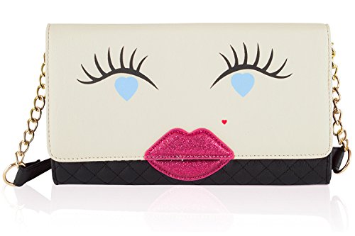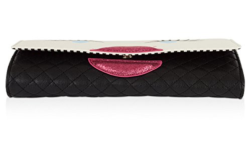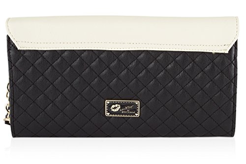 Magnetic snap closure. Exterior features beautiful design at front with brand logo at back and quilted stitch pattern throughout. Interior features zip-pocket and large compartment.