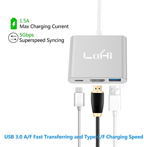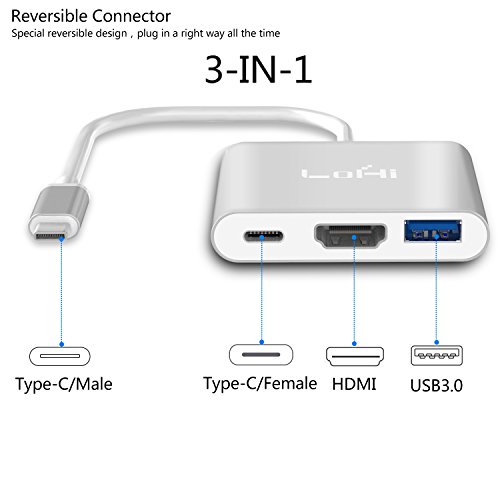 USB-C-to-HDMI, LoHi 3-in-1 Digital Multiport Adapter, USB-C Quick Charging + HDMI (Supports 4K) + USB 3.1 Port, for HDMI Converter and MacBook /ChromeBook Pixel/USB-C Devices (Silver) (HDMI)