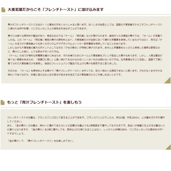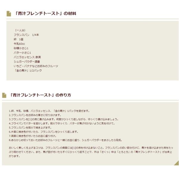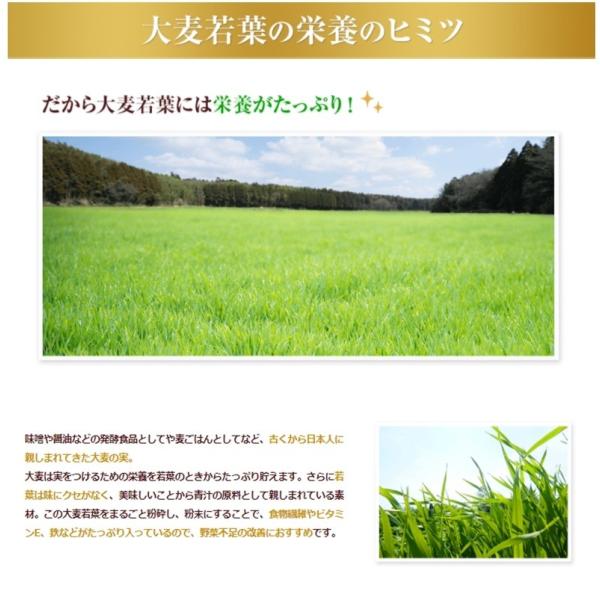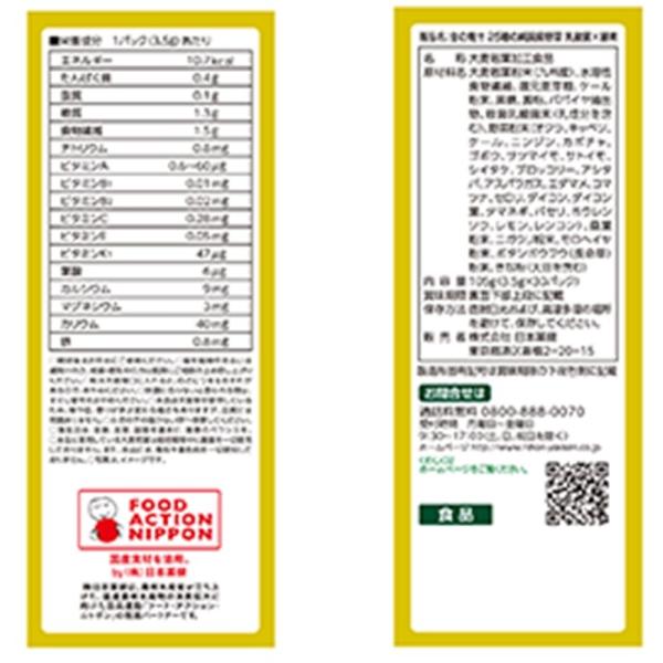 大麦若葉粉末(九州産)、水溶性食物繊維、還元麦芽糖、ケール粉末、黒糖、澱粉、パパイヤ抽出物、殺菌乳酸菌末(乳成分を含む)、野菜粉末(オクラ、キャベツ、ケール、ニンジン、カボチャ、ゴボウ、サツマイモ、サトイモ、シイタケ、ブロッコリー、アシタバ、アスパラガス、エダマメ、コマツナ、セロリ、ダイコン、ダイコン葉、タマネギ、パセリ、ホウレンソウ、レモン、レンコン)、桑葉粉末、ニガウリ粉末、モロヘイヤ粉末、ボタンボウフウ(長命草)粉末、きな粉(大豆を含む)