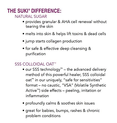 The Suki Difference: Our Sss Technology - The Advanced Delivery Method Of This Powerful Healer, Sss Colloidal Oat. In Our Uniquely, "Safe For Sensitivities" Format - No Caustic, "Vsa" (Volatile Synthetic Active) Side Effects - Peeling, Irritation Or Inflammation. The Natural Sugar Provides Granular & Aha Cell Renewal Without Tearing The Skin, Melts Into Skin & Helps Lift Toxins & Dead Cells, Jump Starts Collagen Production, For Safe & Effective Deep Cleansing & Purification. Ceramide Lipid Complex: Suki Proprietary ComplexesTM Combine High-Performance Ingredients To Target Issues Safely & Effectively And Calming Complexion Complex: Contains High-Potency Extracts: Lavender, Chamomile, Calendula & Rose Hip, Calms Stressed, Irritated & Troubled Skin.Feature