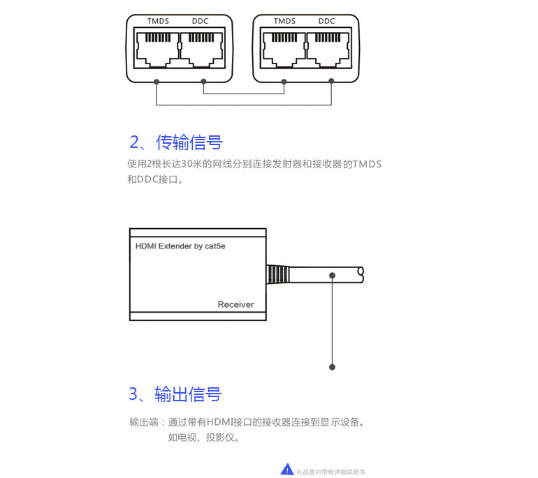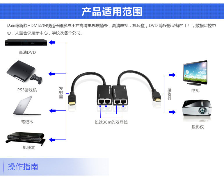 HDMI 双绞线延长器Sender(发射单元)放置在电脑、机顶盒或DVD播放器的旁边。使用延长器标配的电缆将DVI或HDMI信号源和单元连接起来,将HDMI 延长器Receiver(接收单元)放置在高清的显示器旁边,远离信号源30米,把显示器连接至延长器的接收单元,再用2条网线(网线需要达到超5类或6类,否则将不能显示)电缆将发射单元和接收单元连接起来便可以享受的高清影音。
