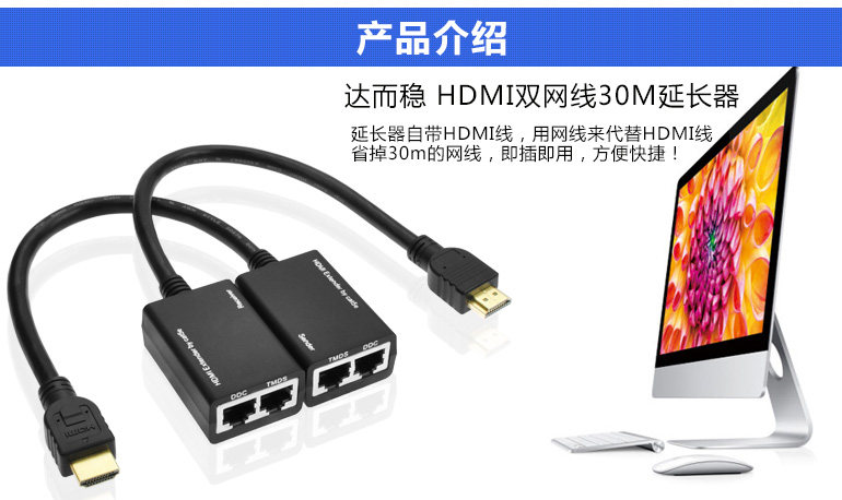 达而稳这款HDMI网线延长器不仅突破了HDMI Cable的传输重要的是CAT-5e/6在接线施工时具有灵活性和便利性。它配有HDMI(高清晰多媒体界面)连接端口,配合使用HDMIDVI转换头使用时,支持DVI(交互式数字视频系统)设备。双绞线延长器使用两根CAT-5e/6 电缆可以将你的HDTV显示器延长30M。 当整合单独的家庭影院时有灵活性和组成选择。