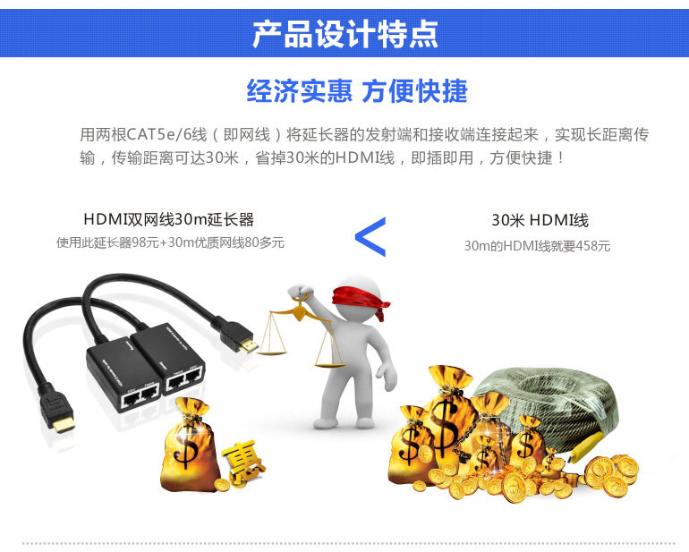 ?[ 特性 ]1.通过2条CAT-5e/6网线将1080P全高清HDMI信号延长至30米