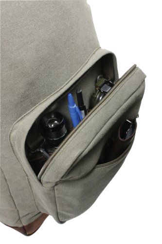 -. Feature : Heavy Weight washed cotton canvas with leather bottom / Large main compartment with zippered closure, cell phone pocket, and cushioned section perfect for a laptop / Front zippered pouch with exterior zippered pocket / Adjustable shoulder straps and top carry handle / Measures: 17" x 13" x 5 1/2"