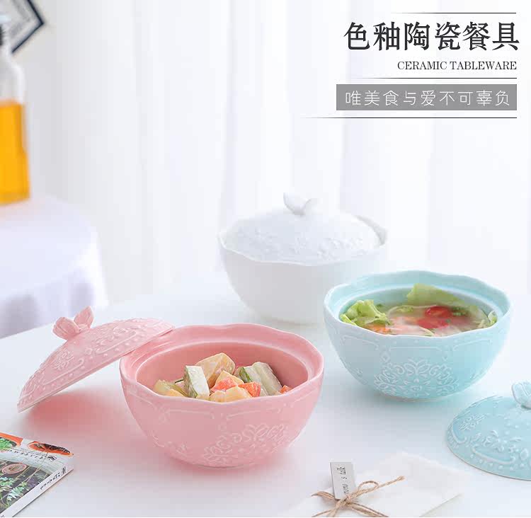 出口韩国创意色釉陶瓷带盖面碗 微博炉烤箱适用餐具家用保鲜汤碗