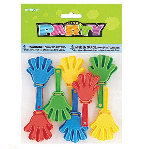 -. Binding : Kitchen -. Brand : Unique -. EAN : 0011179086047 -. Feature : Package of 8 Mini Hand Clapper Party Favors / Plastic Hand Clappers measure 3" and come in assorted colors / A fun party favor for a kid's birthday party / Noisemakers make excellent party favors and game prizes / Coordinate with other kid party supplies and party favors -. IsAdultProduct : 0 -. ItemPartNumber : 8604 -. Label : Unique Party Favors -. Manufacturer : Unique Party Favors -. Model : 8604 -. MPN : 8604 -. PackageQuantity : 1 -. PartNumber : 8604 -. ProductGroup : Kitchen -. ProductTypeName : KITCHEN -. Publisher : Unique Party Favors -. Studio : Unique Party Favors -. Title : Hand Clappers Party Favors, 8ct -. UPC : 011179086047 -. Warranty : No Warranty
