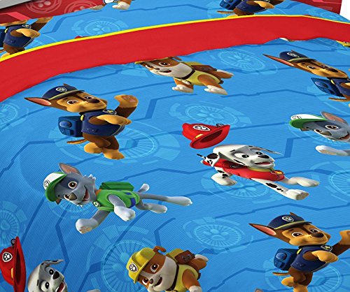 Kids will love this PAW PATROL sheet set! The flat and fitted sheets both feature an all-over print of the PAW PATROL puppies and will fit a standard twin bed. The light blue fitted sheet is 39 x75 inches and the dark blue flat sheet is 66 x 96 inches.The standard size reversible pillow case features Marshall the fire dog and Chase the police dog on one side and the PAW PATROL logo on the other side. This PAW Patrol sheet set is made of 100% polyester microfiber. Machine wash cold before use with like colors: use non-chlorine bleach if needed. Tumble dry low, remove promptly and use warm iron if needed.Feature