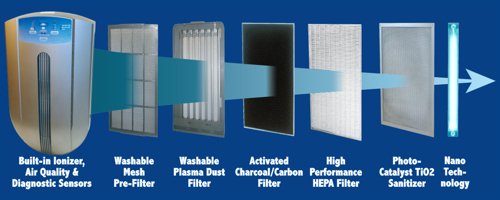 -. Feature : Unique 9-stage detection, filtration and purification system includes: 1. Air Quality Sensors; 2. Diagnostic Sensors; 3. Pre-Filter; 4. Electrostatic Dust Collector; 5. Activated Carbon Filter; 6. High-Performance HEPA Filter; 7. Germicidal UV Light; 8. Dual Photo Catalyst Nano-TiO2 Germicidal Sanitizers; and 9. Negative Ion Generation. / Filters pollen, smoke, air pollutants, odors, bacteria, germs, mold pet dander and more... / Sophisticated dust and odor sensors automatically monitor air quality. / System self adjusts based on air quality. / Purifies nearly 800 sq. ft.