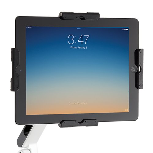 -. Feature : Universal tablet holder for flexibility and maximum freedom / Dual arm design provides maximum adjustment with wider reach / Elegant design features aluminum alloy construction for great durability / C-Clamp desk mount base offers ease of installation / Anti-theft security features allowing display in public area / Cable management offers untangled wires and cables