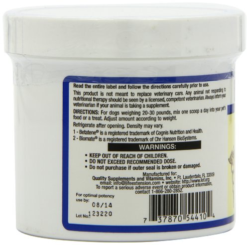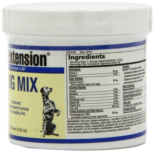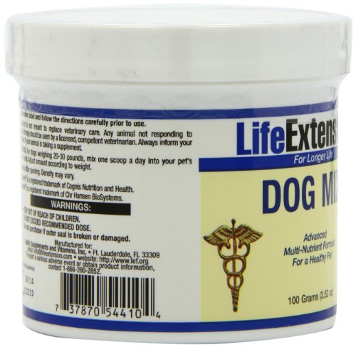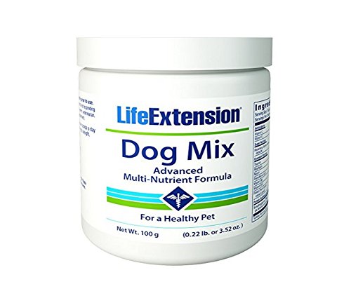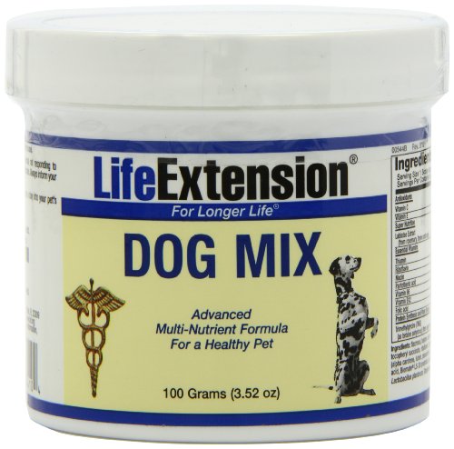 -. Binding : Health and Beauty -. Brand : Life Extension -. EAN : 0737870193111 -. Feature : Serving Size: 2 scoops / 100 Grams Powder / The Life Extension pet supplements contain the same pharmaceutical-grade nutrients used in the products consumed by Life Extension Foundation members -. IsAdultProduct : 0 -. Label : Life Extension -. LegalDisclaimer : * These statements have not been evaluated by the Food and Drug Administration. This product is not intended to diagnose, treat, cure or prevent any disease. **Always refer to the manufacturer's label on the product for description, recommended dose and precautions. -. Manufacturer : Life Extension -. MPN : 00544 -. NumberOfItems : 1 -. PackageQuantity : 1 -. PartNumber : 00544 -. ProductGroup : Health and Beauty -. ProductTypeName : HEALTH_PERSONAL_CARE -. PublicationDate : 2011-01-12 -. Publisher : Life Extension -. Size : 100 g -. Studio : Life Extension -. Title : Life Extension Dog Mix Powder, 100-Grams -. UPC : 737870544104