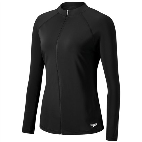 -. Binding : Sports -. Brand : Speedo -. Color : Black -. Department : womens -. Feature : 78% Econyl (Recycled Nylon)/22% Lycra XTRA LIFETM fiber / Imported / Speedo's PowerFLEX Eco fabric is made with 78% Econyl, a nylon fabric of 100% regenerated nylon from pre and post consumer waste / Retains its shape up to 10X longer than traditional swimwear fabrics / Offers 4X the compression of standard fabrics / 30% more resistant to fiber breakage in chlorine compared to PowerFLEX / Good for the environment, even better for swimmers -. Label : Speedo Men's and Women's Swimwear -. Manufacturer : Speedo Men's and Women's Swimwear -. MPN : 7237143 -. PackageQuantity : 1 -. PartNumber : 7237143 -. ProductGroup : Sports -. ProductTypeName : SWIMWEAR -. Publisher : Speedo Men's and Women's Swimwear -. Size : varies -. Studio : Speedo Men's and Women's Swimwear -. Title : Speedo Women's PowerFLEX Eco UPF 50+ Long Sleeve Zip-Front Rashguard